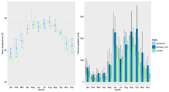 The regional climate is tropical sub-humid with slightly higher air temperatures in summer than in winter (Figure 2). The average annual temperature between 2013 and 2017 was ~27 °C [46]. Average annual precipitation ranges from 1000 to 1500 mm, while the period between May and November is characterised by pronounced rainfall, and the relatively dry period extends between December and April (Figure 2) [46]. Furthermore, the rainfall increases from north (~1100 mm mean annual total precipitation between 2013 and 2017 for the federal state of Yucatan) to south (~1400–1450 mm mean annual total precipitation between 2013 and 2017 for the federal states of Campeche and Quintana Roo, respectively). The forests in the north-western part of the peninsula have experienced slash-and-burn agriculture for 2000 years, resulting in forest patches at different succession stages [47]. In contrast, the southern and eastern parts of the Yucatan peninsula show one of the lowest annual deforestation rates, with some nearly intact areas of tropical forest in Central America (e.g., Calakmul Biosphere Reserve) [47].
