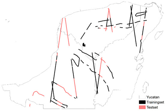 Location of training and validation data using the “spatial sampling” approach of the LiDAR metric p100. Black stripes represent model training data; red stripes represent validation data.