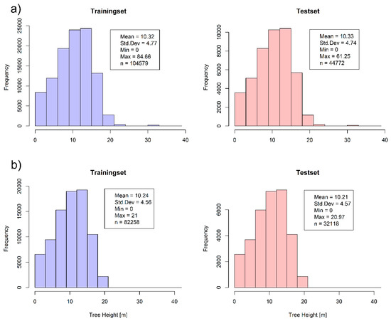 For model training and validation of SAR-based estimates, we applied two different splitting methods of the reference data (i.e., LiDAR-based vegetation height). For both approaches, 70% of the reference data were selected for model training (calibration) and the remaining 30% were used for testing (validation). In the first approach, we applied stratified random sampling, i.e., the data were split based on value intervals with ignoring spatial location of the samples. For this, intervals of 3 m were selected, i.e., 70/30 partition for each 3 m height class. We used intervals of 3 m as a trade-off between a sufficient number of samples for each height class and small enough bins to ensure the intra-class similarity. This splitting approach does not consider spatial autocorrelation between the training and test datasets, which generally results in overoptimistic model prediction statistics [58]. Therefore, in the second splitting approach, we divided the reference data based on their spatial location using k-means clustering of spatial coordinates (i.e., latitude and longitude) (Figure 3) using the R package “sperrorest” [58]. The first splitting approach will hereafter be called “stratified random sampling”, while the second splitting approach will be called “spatial sampling”. After data splitting using a “stratified random sampling” approach, the value distribution in training and test dataset is similar (Figure 4a). In “spatial sampling” after data splitting based on their geographical location, we fit the histograms of training and test data to each other, to ensure that value distribution in both datasets is similar, and the differences in the model’s predictive performance are from spatial autocorrelation and not from different value distributions. For this, the number of samples for specific 3 m height classes have been reduced until similar height distributions in the training and test datasets are reached (Figure 4b).