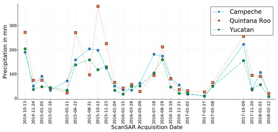 Acquisition dates of the ScanSAR mosaics with corresponding monthly precipitation for the three federal states from [46].