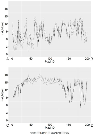 For areas with obvious disagreements between the two maps and where LiDAR data were available, transects of vegetation height (red stripes at the bottom of Figure 7) were generated (Figure 8). Compared to the LiDAR measurements, both SAR-based vegetation height maps show an overestimation of small vegetation and an underestimation of tall vegetation. The over- und underestimation at both ends (small and large trees) is partly caused by a tree-based regression (e.g., Random Forests and Cubist), where single predictions of each tree are averaged. Thus, height at low and high range tends to a mean value. Larger bias is observed for the FBD-based estimates (Figure 8). Accordingly, the increasing number of spatial predictors results in a reduction of the bias at both ends (i.e., the lowest and highest vegetation heights). Moreover, a lower deviation from LiDAR height for the A-B transect between pixel IDs 80–150 (Figure 8) can be observed. This is caused by the fact that this part of the LiDAR transect was used for model training, while other parts are independent (Figure 3 and Figure 8).