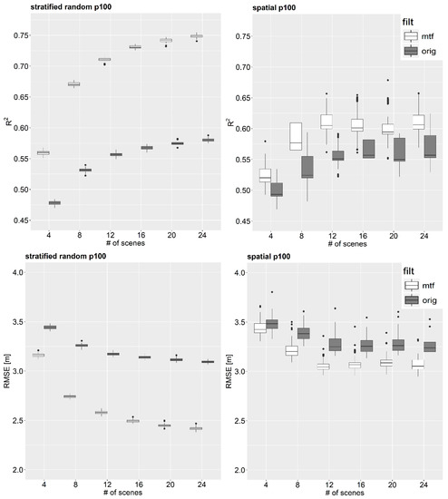 Another observation is that the variance of the model statistics based on “stratified random sampling” is much lower compared to the model statistics based on “spatial sampling”. Considering the models based on “spatial sampling”, those based on filtered data possess higher R2 and lower RMSE compared to those based on unfiltered SAR data (Figure 9 upper and bottom right). However, the differences in the statistics are not as high as in the “stratified random sampling” models. This confirms that the differences between the results based on filtered and unfiltered SAR data using “stratified random sampling” are caused by the spatial autocorrelation of the reference data. Finally, it can be observed that for more than 12 scenes, further increment of acquisitions does not result in further improvement of R2 and RMSE.