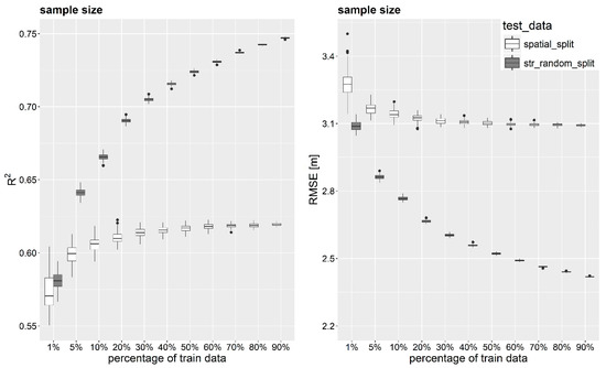 Finally, we examined the impact of the number of training samples on the model prediction performance. Therefore, from the training set, 1%, 5%, and every decile (i.e., 10%, 20% ... 90%) of the data were sampled randomly 100 times and model performance statistics (i.e., R2 and RMSE) for each scenario were analysed. The validation dataset from “stratified random sampling” and “spatial sampling” (e.g., red stripes in Figure 3) remained unchanged.