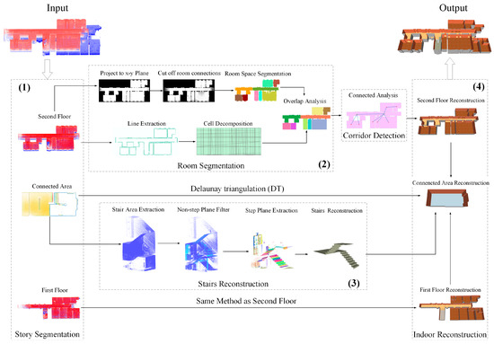 Workflow of the proposed method. (1) Story segmentation. (2) Room segmentation and corridor detection. (3) Stairs reconstruction. (4) Indoor reconstruction.
