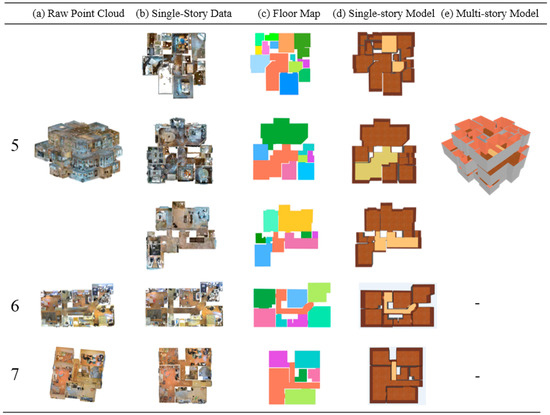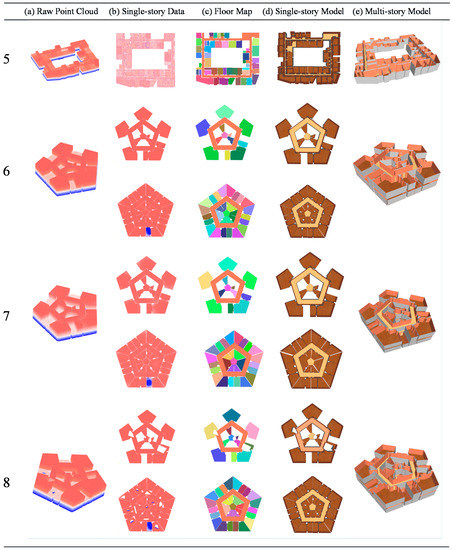 According to the evaluation of Synthetic Data-4 in Table 4, curved walls and round rooms could not be correctly reconstructed, as shown in row 4 in Figure 16c. Instead, a curve was detected as a set of lines along the curve because our method is designed for wall-line extraction and considers a curve to be a set of lines. Thus, the proposed method can only address indoor interiors with perpendicular walls and not curved walls. According to the evaluation of Synthetic Data-6, the proposed method was robust in terms of floor map reconstruction with vertical walls, which were parallel to the gravity vector. However, clutter and occlusion, especially in the corners, affected the level of detail in the reconstruction without altering the coarse structure, according to the evaluation of the first floor in Synthetic Data-7 in Table 4. A small amount of clutter and occlusion slightly affects small details. With more clutter, fewer details may be reconstructed, although the coarse structure could be correctly recovered, as shown in row 7 in Figure 16c. For partially scanned rooms, some walls were not sampled at all, especially in the corners in Synthetic Data-7. Thus, these missing data may have hampered the extraction of wall lines, and some walls could not be detected. According to the performance on the first floor of Synthetic Data-8 in Table 4, the missing data in the rooms could be handled by the proposed method because the labels of the cells in the room were determined by the overlapping and interior non-value cells, which were surrounded by the same labeled cells, and were thus labeled by the neighbors’ label. However, the missing data in the wall area may have hampered the reconstructed floor map, as shown in the second floor of the evaluation of Synthetic Data-8. This result occurred because the missing data in the walls prevented the extraction of certain walls. Thus, the floor map of the second floor of Synthetic Data-8 could not be adequately reconstructed, as shown in row 8 in Figure 16c.