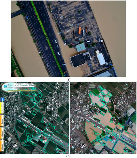 Illustration of the feasibility of mapping the inundated areas with a low-cost unmanned aerial vehicle (UAV). (a) One of the 74 high-spatial-resolution photographs taken by an UAV in Minxiong, Chiayi County in Taiwan on 29 August 2013. The boundary of the inundated area caused by Typhoon Kong-Rey can be clearly delineated from these photographs; and (b) the seamless, color-balanced, and georeferenced mosaic was published on Flood Prevention and Emergency Response System (FPERS) in dual-window mode (left: before-flood; right: after-flood) within 24 h.