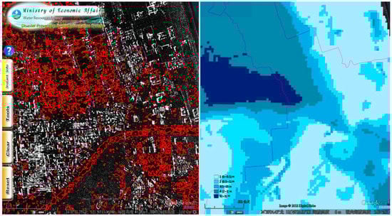 The feasibility of mapping the inundated areas with a low-cost UAV was proven by the Minxiong mission. However, the limitations of deploying a UAV under severe weather conditions to cover a large area were also highlighted by this mission. To remove those limitations, we were motivated to seek another type of imagery from SAR to derive an inundation map [4]. Chung et al. reported a successful case of rapid response with a map of inundated areas derived from COSMO-SkyMed 1 radar satellite imagery during the July 2013 flood in I-Lan County in Taiwan, which was caused by Typhoon Soulik [4]. An SOP was established to identify the inundated area on an SAR image with ancillary information from Formosat-2, and the flood depth was inferred based on a comparison between the flood extent map and different inundation potential maps. This procedure was adopted again after Typhoon Soudelor (August 2015), and the results were shared by FPERS in dual-window mode within 24 h after the SAR image was received, as shown in Figure 3. The left window shows the SAR image of I-Lan County taken by COSMO-SkyMed 1 on 8 August 2015 (Typhoon Soudelor), overlaid with the inundated areas (red polygons), while the right window shows the same SAR image overlaid with the inferred flood depths (color polygons).