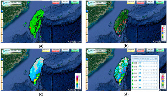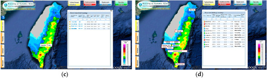 - Meteorology Data: The rainfall distribution in Taiwan is extremely uneven as a result of the four major mountain ranges in the central region that include more than 200 peaks rising higher than 3000 m. For the same reason, the locations of the 916 rainfall stations in Taiwan are also restricted by topography and transportation (Figure 5a), resulting in sparse observations of rainfall in mountainous areas. To tackle this problem, we followed the same Kriging interpolation approach that the CWB employs to generate the gridded precipitation from the real-time rainfall data transmitted from the 916 rainfall stations at intervals of 10 min. This gridded precipitation was further processed as basin, watershed, and administrative area rainfall, based on the polygons of integration in space (Figure 5b). These products could be further processed to generate the one-hour, three-hour, six-hour, twelve-hour, twenty-four-hour, and daily accumulative rainfall, based on the polygons of integration in time (Figure 5c). All these totals were automatically calculated, stored, and managed through a Microsoft SQL (Structured Query Language) database as the real-time rainfall data were transmitted from the 916 rainfall stations every 10 min. A user-friendly function was developed and implemented in FPERS to facilitate user searches, queries, comparisons, and sorting of all meteorological products (Figure 5d). This function can help decision-makers convert the point precipitation from the 916 rainfall stations into colorful polygons of accumulative rainfall, based on the specified basin, watershed, or administrative area.