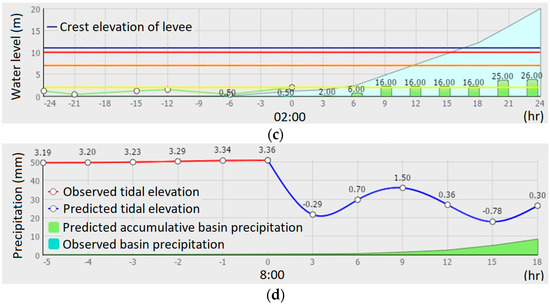 - Hydrology Data: The WRA is in charge of collecting and archiving most of Taiwan’s hydrology data on a systematic basis. Among these data, the water levels from reservoirs, river stations, and tide stations provide valuable information for flood prevention and emergency response. The intensive precipitation brought by typhoons in the mountainous areas not only raises the water level in reservoirs, but also propagates the peak flow downstream, resulting in the rise of water levels at river stations one by one along the river. The time at which the peak flow arrives at the plain and river mouth can be calculated by simply comparing the hydrographs of different river stations, as shown in the Figure 6b,c. On the other hand, the water level at a tide station is mainly dominated by tides that are predictable, as shown in Figure 6c. Flooding becomes a certainty if the high tide coincides with the peak flow. To make the best use of the hydrology data, a user-friendly function was developed and implemented in FPERS to facilitate the ability of users to display hydrographs by clicking any reservoirs, river stations, or tide stations.