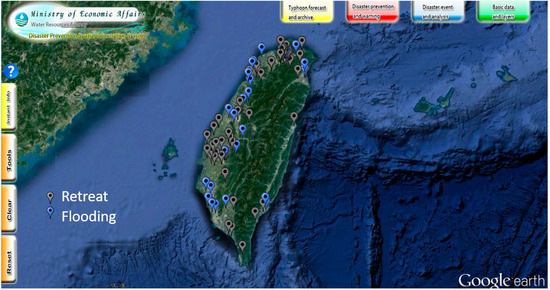 Like the other islands between Japan and the Philippines off the eastern and southeastern coasts of Asia, Taiwan is visited by three to four typhoons per year, on average. Some extreme cases of torrential and sustained rainfall brought by typhoons have caused flooding, severe damage, and significant loss of lives and properties in the past two decades, such as the flooding in Taipei caused by severe Typhoon Winnie (18 August 1997); the flooding in Kaohsiung and Pingtung caused by Tropical Storm Trami (11 July 2001); the flooding in Taipei and Keelung caused by Typhoon Nari (17 September 2001); the flooding in Kaohsiung and Pingtung caused by Typhoon Mindulle (2–4 July 2004); the flooding in middle and southern Taiwan caused by Typhoon Kalmaegi (17–18 July 2008), and the flooding in middle, eastern, and southern Taiwan caused by Typhoon Morakot (6–10 August 2009). To improve our knowledge of flood prevention and emergency response requires a sound collection and analysis of information that is transformed from a huge amount of data. Apart from the historical, real-time, and forecast data in meteorology, the status of pumping stations and mobile machines, the available resources and facilities, as well as many other data, are both crucial and useful to the government and general public. The data must be identified, collected, integrated, processed, analyzed, distributed, and visualized rapidly through the Internet, in order to support a variety of management decisions, particularly a timely response to an urgent event. This was not possible until the Google Earth application programming interface (API) was released on 28 May 2008. After the devastating Typhoon Morakot hit Taiwan in August 2009, the Google Earth API was employed to develop the Formosat-2 pre- and post-Morakot image-comparison system [1] that succeeded in rapid distribution of geospatial information to the general public and government agencies (http://research.ncku.edu.tw/re/articles/e/20110429/1.html). In light of the great potential revealed by the system, the Water Resource Agency (WRA) of Taiwan initiated a multi-year project from 2012 to 2016, which led to the development of the Flood Prevention and Emergency Response System (FPERS) powered by Google Earth Engine (GEE).