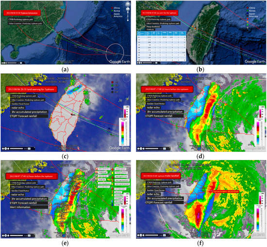 The case of Typhoon Soudelor is used as an example to demonstrate how FPERS was employed to support flood prevention and emergency responses. All related data and layers collected and employed at different stages were recorded in a tour file, which is ideal for reviewing this event by replaying the scenarios in chronological order. Users could even pause or reverse the tour, and they could also add more data or layers at any stage. This tour file is available in the Supplementary Materials. From the file, eight scenarios were captured at different stages, as shown in Figure 10. These are explained in detail as follows.