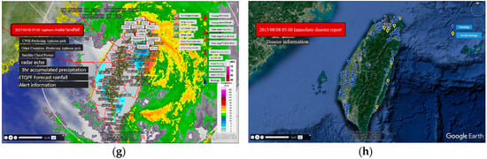 Demonstration of how FPERS was employed to support flood prevention and emergency responses for Typhoon Soudelor. (a) The forecasts of the typhoon path made by the Central Weather Bureau (CWB) of Taiwan and other countries when Typhoon Soudelor formed; (b) the most updated forecasts of typhoon paths overlaid on the map of pumping machines and flood protection materials when the CWB issued the sea alert. The most updated forecasts of typhoon paths overlaid on the satellite cloud images, the radar echo chart, the accumulated rainfall chart; as well as the Ensemble Typhoon Quantitative Precipitation Forecast (ETQPF) (c) when the CWB issued the land warning; and (d) 12 h before the typhoon landed; (e) SAR image of the I-Lan area acquired by COSMO-SkyMed 3 at 05:56 on August 8. Integration of a large number of geospatial data/layers and real-time monitoring data after landfall; including (f) ETQPF; (g) alert information; and (h) real-time disaster reports.