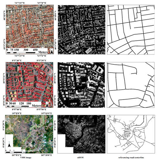 The first dataset shown in the first row of Figure 1 is located in New York; therefore, it is called the New York dataset in this paper. It comes from the object identification dataset [37], which was collected in 2014 and included both VHR images and airborne LiDAR data. The VHR images have a spatial resolution of 15 cm and include four channels of the red, green, blue, and near-infrared bands. The spatial size of the VHR image used in this paper is 5200 × 5000 pixels. The airborne LiDAR data is provided as point clouds and the density is approximately 5 points/m2. In this dataset, roads have similar spectral signatures with other impervious surface (such as the parking lots and buildings) and the road is often covered and sheltered by shadows, trees, and cars.