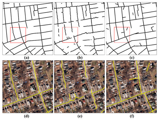 The road centerline network extraction of different methods for New York dataset, in which (a–c) are shown as the road centerline network extraction of the proposed method, Huang’s method [15] and Miao’s method [32], respectively; (d–f) show the corresponding road centerline extraction marked with red rectangle and the road is superimposed on the false-color composite image.