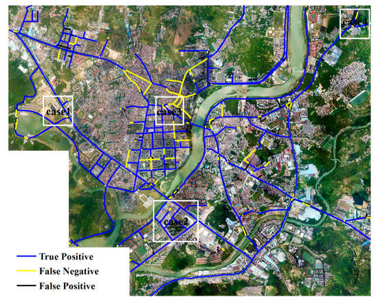Road centerlines is another effective representation of the roads and can clearly show the road topology and accurately locate the position of the road [31]. The morphological thinning is a common method for road centerline extraction [32,33,34], but the accuracy of road centerlines extracted by the method is relatively low [32,33]. To improve road centerlines extraction, Zhang et al. [35] proposed a road centerline extraction method based on the random transform. Poullis et al. [36] used the Hough transform algorithm to extract road centerlines. Although these methods perform well for straight road segments, they are not suitable for the complex road networks. To extract the road centerlines from the complex road networks, Shi et al. [33] first decomposed the road network into unconnected road segments and then extracted the road centerline for each road segment using a locally weighted regression method. Finally, all the isolated road centerlines were further linked to form the road centerline network. Although the method solves the problem of road centerline extraction of multi-branch road networks, the road centerline extraction effect is still poor for the curve road segments.