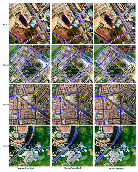 Figure 6 shows the road centerline network extraction for the Guangzhou dataset. Figure 7 shows the local comparison of road centerlines extracted by different methods. It is not difficult to find from Figure 6 that the proposed method can correctly extract most of the road centerlines for a wide range with complex scene, but there are some omissions. Case 1 in Figure 7 shows that in road segments where road widths change greatly, all three methods can extract the road centerlines. Nevertheless, comparison indicates that the road centerlines extracted by the proposed method are the most accurate, while one extracted by Huang’s method is less smooth, and some strip bares are identified as roads in one extracted by Miao’s method. Case 2 in Figure 7 shows the road centerline extraction of the area where there are many non-road impervious surface. In this scene, Huang’s method and Miao’s method are easy to mistake non-road impervious surface as the roads, and the narrow road segments are easy to be missed. Case 3 in Figure 7 shows the road centerline extraction of different methods in the case of serious interference. We can find from this case that it is difficult for all three methods to accurately extract the centerlines of the road segments in which most of area is shielded by shadows and trees. Case 4 in Figure 7 shows the road centerline extraction of the curved road segment and road intersections. According to the case, the road centerlines extracted by the proposed method are relatively smooth, but there is usually a deviation in the section of road segments with large curvature. However, Huang’s method can effectively overcome the deviation problem of road centerlines of curved road segments. Compared with the road centerlines extracted by proposed method, although the smoothness of one extracted by Miao’s method is low, the centerlines of road intersections are relatively accurate. Table 3 shows the quantitative assessment of road centerline extraction of different methods for the Guangzhou dataset. Compared with the New York dataset and the Vaihingen dataset, although the accuracies of the road centerline network slightly decreases, the completeness and correctness are both greater than 0.8, and even the correctness is as high as 0.9354. Meanwhile, the completeness, correctness, and quality of the road centerline network extracted by the proposed method are highest. Therefore, the proposed method can be applied to road centerline network extraction of a wide range with complex scenes.