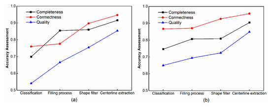 The accuracies of key processing result including classification, filling process, shape filter, and centerline extraction. (a) New York dataset; (b) Vaihingen dataset.