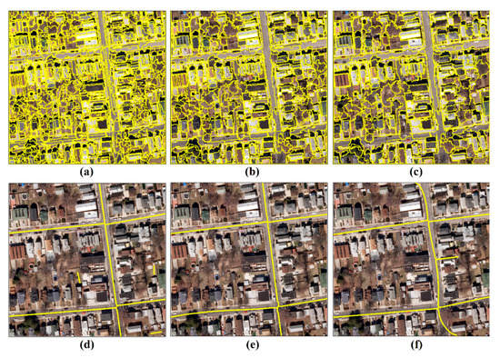 The road centerline extraction of different scale parameter. (a–c) show the image segmentation of the scale parameter as 80, 140, and 200, respectively; (d–f) show the road centerline extraction of corresponding scale parameter.