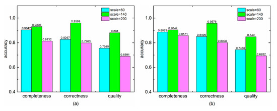 Figure 10 shows the accuracies of road centerline network extracted by different scale parameters. The investigations for both two datasets show a similar conclusion—that the road centerline extraction of scale parameter 140 has the highest completeness, correctness, and quality. Compared with over-segmentation, a slight under-segmentation can achieve better road centerline extraction for the proposed method.