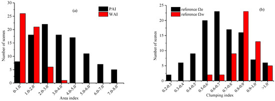 Frequency distributions of true PAI and WAI (a), and reference and (b) of leaf-on and leaf-off forest scenes, respectively.