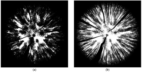 An in-house software product called In situ LAI Measurements Simulation and Validation Platform (ILMSVP, version 2016) (Appendix B) was developed using the C++ programming language. This software was used to generate the explicit 3D forest scene series and simulated DHP images. The generated leaf-on forest scenes comprise the leaf-on broadleaved deciduous and evergreen coniferous forest scenes, and the leaf-off forest scenes are the leaf-off broadleaved deciduous forest scenes. The leaf-on deciduous forest scenes were generated using ILMSVP based on all the broadleaf 3D tree models from JBSS. To avoid the true LAI values of the generated leaf-on deciduous forest scenes are far larger than the maximum LAI of 4.76 for the birch plot, as reported by Sumida et al. [54], those scenes with LAI > 5.0 were discarded and excluded from this study. In addition, all the leaves were removed from the tree models in the sub-series deciduous scenes of JBSS to represent the leaf-off period of the sub-series deciduous scenes of JBSS (JBSW). Amongst the six broadleaf tree species of maple (Acer Platenoides), birch (Betula Pendula), alder (Almus Glutinosa), linden (Tilio Cordata), poplar (Populus Tremuloides), and ash (Fraxinus Exelsior) in JBSS, the birch tree species is the dominant species. Therefore, the leaf-on and leaf-off broadleaved deciduous forest scenes can be treated as the birch forest scenes. The leaf-on coniferous forest scenes were generated using ILMSVP based on all needleleaf 3D tree models from JPSS, OPSW, and six Scots pine models, respectively. Therefore, three sub-series of leaf-on coniferous scenes were generated, namely JPSS, OPSW, and Scots pine scenes (SPS). Similar to the leaf-on deciduous scenes, all the PAI of the generated two sub-series coniferous scenes of SPS and OPSW were below the maximum PAI of 7.8 and 1.9 of the Scots pine and Mountain pine forest sites, respectively, as reported by Walter [55] and Thimonier et al. [23], respectively. The two 3D tree models of the Norway spruce and birch were not used in generating the two sub-series coniferous scenes of JBSS and JPSS, respectively, for the purpose of generating pure deciduous and coniferous forest scenes. Because the proportions of the number of Norway spruce and birch trees to the total number of trees in JBSS and JPSS are as small as 3% and 0.5%, respectively. Therefore, the removal of the two 3D tree models of Norway spruce and birch in the generation of the two sub-series coniferous scenes of JBSS and JPSS would not make the main canopy structural characteristics of the two sub-series coniferous scenes of JBSS and JPSS deviate obviously from those of the two scenes of JBSS and JPSS in RAMI project, respectively. In this study, a total of 156 forest scenes were constructed based on the 50 detailed 3D tree models described. The four scenes of JPSS, OPSW, JBSS, and JBSW in the RAMI project were also used in this study. These forest scenes are reclassified into two types: leaf-on and leaf-off. The number of leaf-on and leaf-off forest scenes were 106 and 54, respectively. Table 1 provides the main characteristics of the simulated 3D forest scene series. The frequency distributions of the true PAI and WAI (a), and the reference and (b) of the simulated leaf-on and leaf-off forest scenes are shown in Figure 1. Figure 2 shows two simulated binary DHP images generated at the same sampling point at leaf-on and leaf-off periods of a deciduous forest scene.