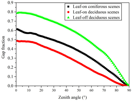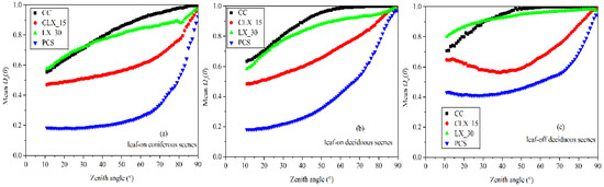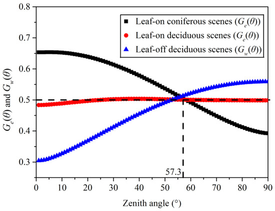 The of leaf-on coniferous scenes presents a trend similar to the planophile projection function, and they are decreased with zenith angles in the range of 0–90° (Figure 5). The of leaf-on coniferous scenes is intersected with the line of = 0.5 at the zenith angle near 57.3° (Figure 5). In contrast, the of leaf-off deciduous scenes exhibits a similar trend to the erectophile projection function, and they are increased with zenith angles in the range of 0–90° (Figure 5). The of leaf-off deciduous scenes is intersected with the line of = 0.5 at the zenith angle near 52° (Figure 5). The of leaf-on deciduous scenes exhibits a trend similar to spherical projection function, and the is close to 0.5 at all the zenith angles ranging from 0° to 90° (Figure 5).
