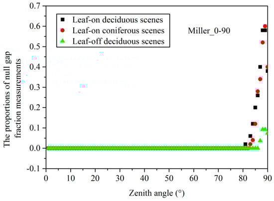 For Miller_0-90, Figure 4 illustrates that the proportions of the number of scenes with null gap measurements to the total number of leaf-on deciduous and coniferous scenes at zenith angles in the 0–90° range are equal to zero if the zenith angles are <80°, and then they increased obviously at the zenith angles >80° and approach the maximum of 0.58 at the zenith angle of 88°. Compared with leaf-on forest scenes, the proportions of scenes with null gap measurements to the total number of leaf-off scenes at zenith angles in the 0–90° range are small; they are equal to zero if the zenith angle is <86° and approach the maximum of 0.09 at 87° (Figure 4). By contrast, for DHP_0-90, the proportions of the number of scenes with null gap measurements to the total number of leaf-on and leaf-off forest scenes at each annulus are always equal to zero.