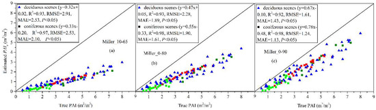 The performance of the seven inversion models in estimating the PAI of leaf-on coniferous and deciduous scenes was largely improved if the and were considered in the PAI estimation, except the combinations of the inversion models, , estimation algorithm, and segment size with PCS (Figure 7, Figure 8 and Figure 9). For leaf-on coniferous and deciduous scenes, the PAI, which was estimated from the seven inversion models considering and , was closer to the one-to-one line compared with the estimated from the same inversion model without consideration of and , except the combination of inversion model, , estimation algorithm, and segment size with PCS (Figure 7, Figure 8 and Figure 9). For example, for leaf-on deciduous scenes, clear evidence of the improvement in the PAI estimation was provided by the fact that the RMSE, MAE, and regression slope of the estimates, which were estimated from Miller_0-90 without consideration of and , were 1.61, 1.43, and 0.67; they decreased to 0.83, 0.54, and 0.82 when and LX_5 were considered in the PAI estimation (Figure 7 and Table A1).
