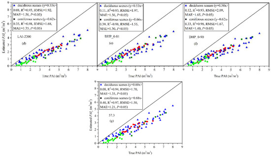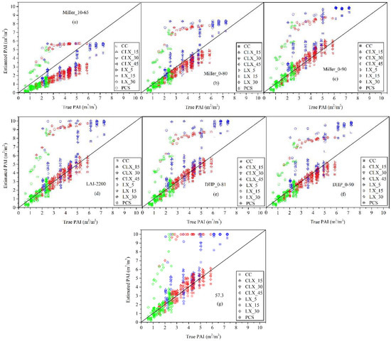 (a–g) Comparison of true PAI of leaf-on deciduous forest scenes with PAI calculated from the seven inversion models with consideration of and . Four estimation algorithms (CC, LX, CLX, and PCS) were used to estimate the of leaf-on deciduous scenes.