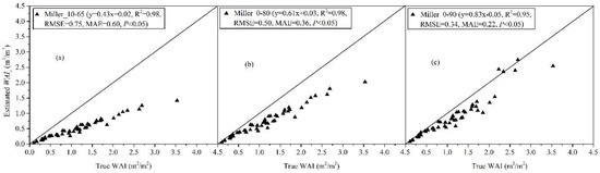 All the seven inversion models tended to underestimate the WAI at the majority of leaf-off scenes if was not considered in the WAI estimation (Figure 10). The estimates derived from the seven inversion models are 28–126% of the true WAI of leaf-off deciduous scenes (Figure 10). Most of the estimates derived from Miller_0-90 and 57.3 were 63–90% of the true WAI of leaf-off deciduous forest scenes (Figure 10c,g). Based on RMSE, MAE, and regression slope, the 57.3 inversion model performed the best amongst the seven inversion models to estimate the of leaf-off deciduous forest scenes with the smallest RMSE and MAE, followed by Miller_0-90 and LAI-2200 (Figure 10d,g). The worst results were obtained with Miller_10-65 with the largest RMSE and MAE compared with other inversion models (Figure 10a).