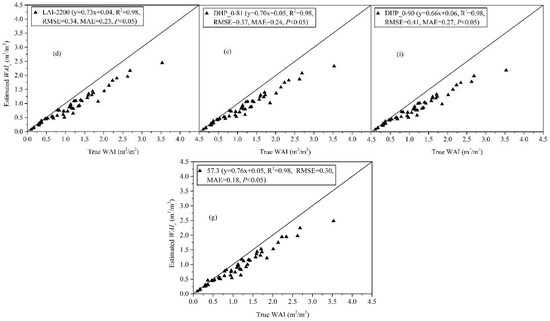 Comparison of true WAI of leaf-off deciduous forest scenes with estimates derived from seven inversion models without considering : (a) Miller_10-65 (), (b) Miller_0-80 (), (c) Miller_0-90 (), (d) LAI-2200 (), (e) DHP_0-81 (), (f) DHP_0-90 (), and (g) 57.3 (). The estimates were estimated using Equations (3)–(7), (9) and (10) with consideration of (, , , and are assumed to be equal to 1). Statistics are given at 95% confidence level from two-tailed Student’s t-test.
