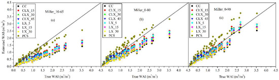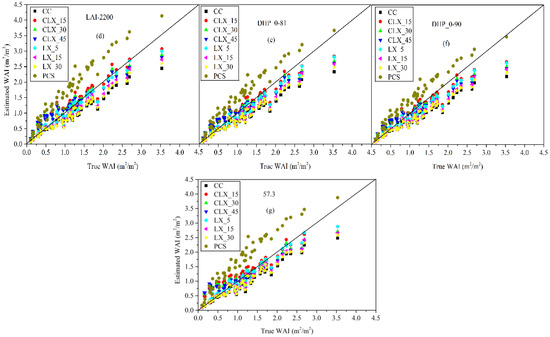 (a–g) Comparison of true WAI of leaf-off deciduous forest scenes with WAI calculated from the seven inversion models with consideration of and . Four estimation algorithms (CC, LX, CLX, and PCS) were used to estimate the of leaf-off deciduous scenes.