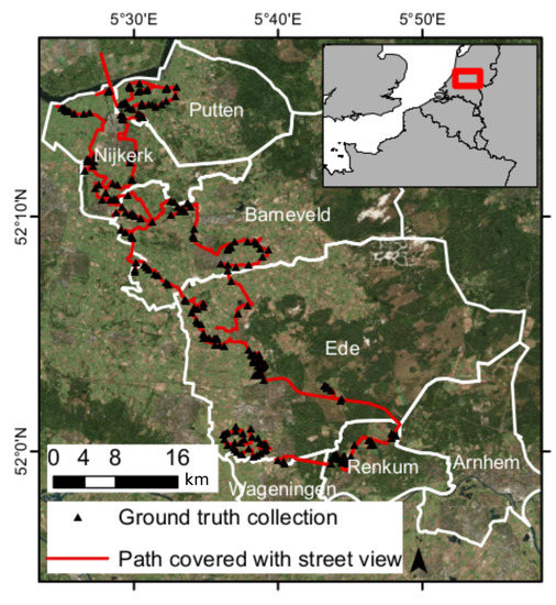 The study site is the Gelderse Vallei including 7 municipalities: Ede, Wageningen, Renkum, Barneveld, Arnhem, Putten and Nijkerk. The ground-truth points were collected during a field visit; geo-tagged street-level imagery was acquired simultaneously at 1 frame per second along the survey path.