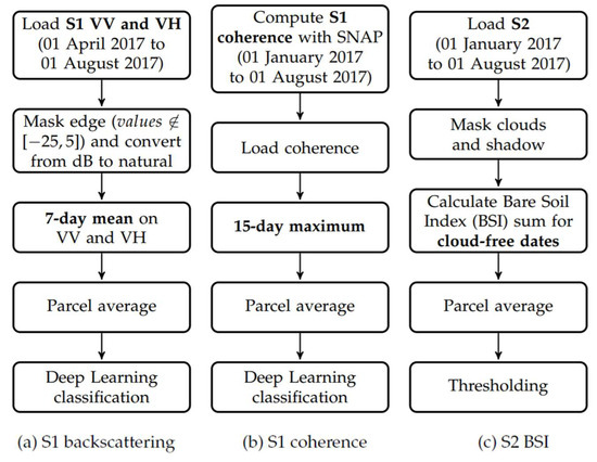 Main processing steps for S1 backscattering (a), S1 coherence (b) and S2 BSI (c).