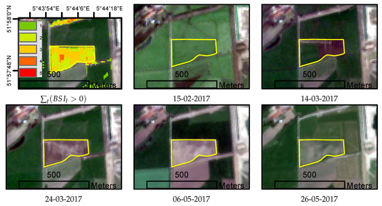 Parcels are marked with the S2-BSI when the soil was detected as bare more than 1 time in the period 1 April to 1 August (i.e., Equation (2) ).