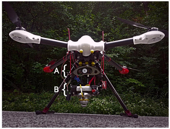 Preparation of the UAV for flight. The gimbal (A) is visible underneath the UAV, equipped with the downward-facing pyranometer secured beneath (B).