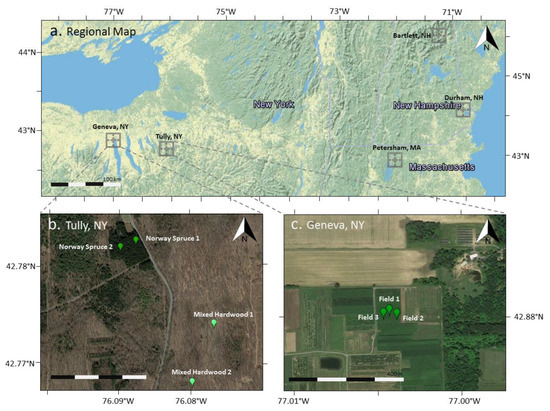 Targeted UAV surveys over mixed hardwood forest took place in Tully, NY, USA at a closed-canopy mixed northern hardwood forest stand (Figure 3b; Table 1). Comparative tower and satellite-based measurements from other mixed hardwood sites were obtained from three sites with existing long-term tower albedo measurements, in Bartlett, NH; Durham, NH; and Petersham, MA (Figure 3a; Table 1). All three sites represented a temperate climate and mixed northern hardwood forest land cover. Albedo at each comparative site was obtained from a fixed-point tower and from MODIS satellite data. Validation UAV flights took place in Geneva, NY, USA over a cropped willow field (July 2017), where low height of vegetation allowed both tools to be used simultaneously (Figure 3c; Table 1). Finally, additional UAV flights at a Norway spruce monoculture stand (July 2017) were combined with 2017 forest and willow data for a comparison of different land uses (Table 1).