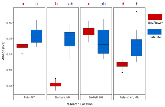 Boxplots showing albedo over mixed temperate forest as measured by UAV (red) and MODIS satellite data (blue) in (a) Tully, NY and by fixed towers (red, 0.145 ± 0.003 SD, n = 5) and MODIS satellite data (blue, 0.152 ± 0.005 SD, n = 70) at (b) Durham (red, 0.121 ± 0.015 SD, n = 12; blue, 0.151 ± 0.006 SD, n = 23), (c) Bartlett (red, 0.155 ± 0.008 SD, n = 13; blue, 0.148 ± 0.008 SD, n = 18), and (d) Petersham (red, 0.133 ± 0.009 SD, n = 12; blue, 0.145 ± 0.008 SD, n = 18). Box and whisker plots show medians, data quartiles, and outliers. Letters over tower and satellites represent significant differences within UAV and tower measurements at Tully, Durham, Bartlett, and Petersham (calculated by ANOVA, Tukey HSD), and within satellite measurements at each of the same (calculated by ANOVA, Tukey HSD).