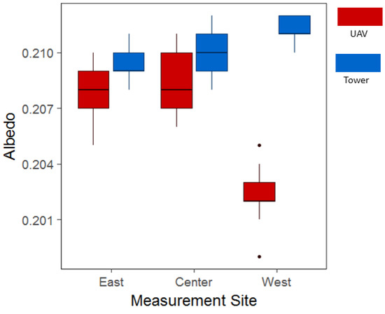 Albedo was measured by UAV over a willow biofuel field at three sites: immediately adjacent to a fixed tower (0.208 ± 0.001 SD, n = 19), 24 meters east of the tower (0.208 ± 0.002 SD, n = 23), and 24 m west of the tower (0.202 ± 0.002 SD, n = 21). Tower measurements were taken simultaneously with each flight from a fixed location at center (0.209 ± 0.001 SD, n = 19; 0.210 ± 0.001 SD, n = 23; 0.211 ± 0.001 SD, n = 21). UAV measurements are depicted in red, while paired, simultaneous fixed tower measurements are depicted in blue. Box and whisker plots show medians, data quartiles, and outliers.
