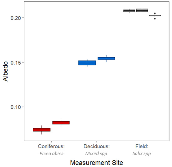 Albedo measured by UAV for three different land use types: two adjacent coniferous forest sites at Tully, NY (0.074 ± 0.002, n = 24; 0.082 ± 0.002, n = 23) (red), two adjacent mixed northern hardwood forest sites at Tully, NY (0.149 ± 0.002, n = 22; 0.154 ± 0.002, n = 23) (blue), and three adjacent cropped willow sites at Geneva, NY (0.208 ± 0.001, n = 19; 0.208 ± 0.002, n = 23; 0.202 ± 0.002, n = 21) (gray). Error bars represent the variance, reported as standard error, within each flight.