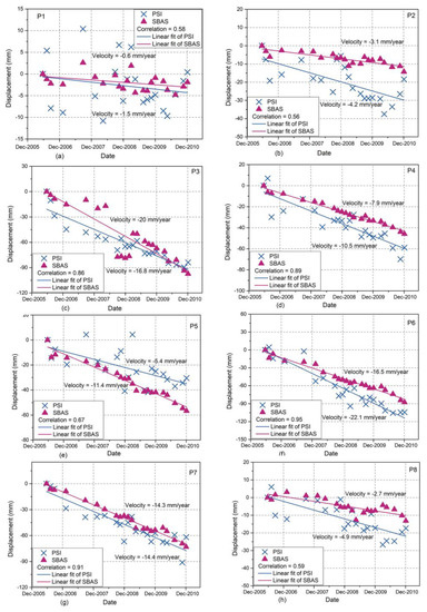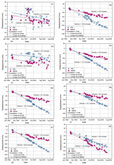 Time-series LOS displacement plots of the PSI and SBAS measurements from the ERS-1/-2 data (a–h) for the selected points P1 to P8, which are indicated by red points in Figure 3.