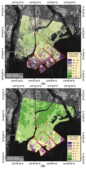 Mean LOS displacement velocity in Urayasu City from 2006 to 2010 for the PALSAR data: (a) estimated mean displacement velocity using the PSI method; (b) estimated mean displacement velocity using the SBAS method. The background image is a PALSAR-2 intensity image acquired on 04 December 2014. The red points P1 to P8 are the selected points to show the time-series LOS displacements estimated by the PSI and SBAS measurements in (a,b), respectively. A-G represent the reclaimed areas and districts which described in Table 1.