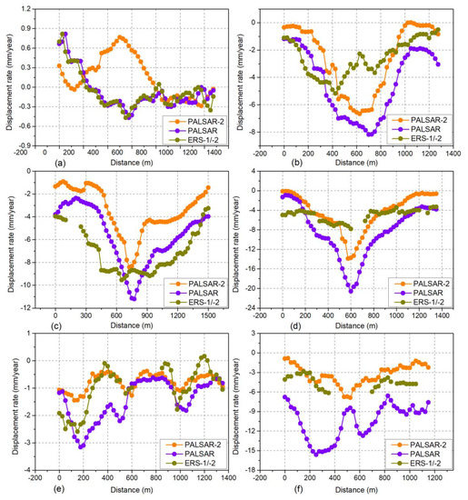 The mean velocity (mm/year) maps of the displacements for the period from December 2014 to November 2017 are shown in Figure 9. The same color cycle from green to purple was used for the result. In the study area of over 690,336 pixels, 76,500 measurement points were obtained by the SBAS method. The histogram of the SBAS-derived displacement velocity for the study area is shown in Figure 10. The average displacement rate and the standard deviation are −0.5 mm/year and 1.9 mm/year, which are lower than those obtained with the ERS-1/-2 and PALSAR data. In general, the PALSAR-2 results show that approximately 85% of the PS points indicate displacement rates between −3 mm/year and 1 mm/year (Figure 10). To show the variations in the LOS displacement velocities at different locations over the three observation periods, six profiles across several locations in Urayasu City were selected (Figure 9). We can see from Figure 11 that these selected profiles show different displacement dispersion patterns, such as profiles P1–P1’ and P5–P5’ which show a dispersion of approximately −0.5 mm/year to −2.6 mm/year. Along profile P4–P4’, the subsidence rate increased from 0.1 to 21 mm/year within the distance of 0.6 km. The profiles in Figure 11b–d,f reveal that the PALSAR-estimated subsidence rate has a larger value than those from the ERS-1/-2 and PALSAR-2. Contrary to the ERS-1/-2 and PALSAR-estimated displacement velocity, the PALSAR-2 results show an uplift within the distance of 300 to 900 m in the profile P1–P1’ across the Moto-Machi area (Figure 11a). Moreover, both PALSAR and PALSAR-2 estimated displacement rates show a significantly decrease along P4–P4’ (Figure 11d).