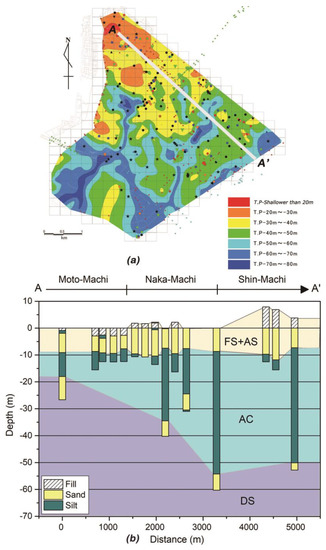 Depth of the upper surface of the solid geological stratum (a) in Urayasu City (adapted from the public report by the technical committee of Urayasu City [54]). The points refer to the locations of borehole sites; (b) soil cross sections along the A–A’ line. FS + AS refer to filled sandy soil and alluvial sand layers, and AC and DS refer to the alluvial clay layer and diluvial dense sandy layer, respectively. The borehole investigation data were obtained from the Chiba Prefecture [55].