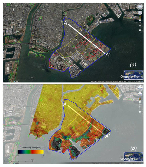Subsidence rate map (2006–2010) generated with ALOS PALSAR data overlaid on a Google Earth image. The green polygons indicate the park area, red polygons indicate the location of high-rise buildings, the yellow polygon shows the highly populated residential area. The blue polygon indicates the border of Urayasu City and corresponds to the location of Figure 14a, and the A–A’ line corresponds to the soil cross section in Figure 14a,b.
