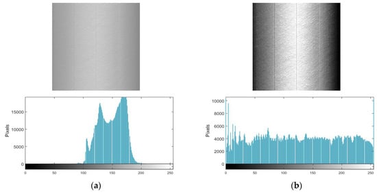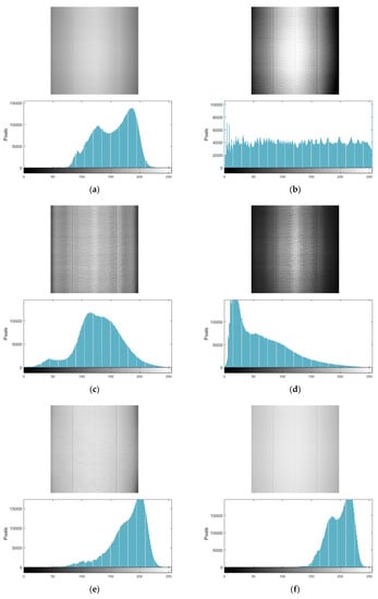We used the equation above to correct the images in Figure 5h, Figure 6h, and Figure 7h. The corrected images and histograms are shown in Figure 13. It can be seen that pixels with weaker response between the various taps can be effectively corrected, and the visual effect of the image can be effectively improved.