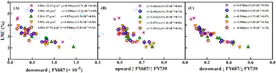 4.3. Performance of the Relationships between SIF Yield Indices and LNC under the Varied Chl Content and Leaf Structure LMA