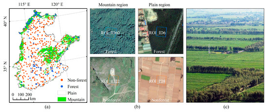 In this study, we applied Bowley’s proportional allocation statistical technique (Equation (4)) to attain validation samples [43] from the very high resolution (VHR) remote sensing images of Google Earth circa 2010 to guarantee equal probabilities of obtaining the validation samples. Google Earth has been widely used in land cover map validations [44]. First, the sampling was stratified by class (forest layer and non-forest layer), according to the PL-based forest map, and then the random points were generated in the ArcGIS software. Second, according to these random points, we established 30-m by 30-m squares as Regions of Interest (ROIs), which can guarantee landscape homogeneity and accuracy of the validation result [45,46]. Specifically, we dropped those vague ROIs to guarantee the quality of the ROIs. Finally, a total of 543 ROIs were obtained, including 147 forest ROIs and 396 non-forest ROIs (Figure 4a). Given a larger difference in the forest spatial distribution, the NCP was divided into mountain region and plain region based on different elevations (Figure 1). Figure 4b illustrates the four validation ROIs including the mountain region and plain region from the VHR images of Google Earth from around 2010.