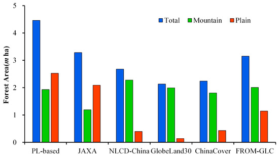 Figure 7 shows the forest areas of the PL-based and the other five forest maps in the NCP, mountain region, and plain region. The total forest area of the PL-based forest map is approximately 4.46 m ha in the NCP 2010, followed by JAXA (3.28 m ha) and the FROM-GLC forest map (3.15 m ha). The total forest area of the GlobeLand30 forest map is 2.13 m ha, which is the lowest among the six forest maps. In the mountain region, the estimated forest area among these forest maps shows a smaller difference, while the estimated forest area show a larger difference in the plain region. Specifically, the forest area of the PL-based forest map is 1.93 m ha in the mountain region, which is similar to the Landsat-based forest maps estimated forest area from 1.80 to 2.28 m ha. The larger difference exist between JAXA (1.19 m ha) and the other five forest maps in the mountain region, due to the higher omission error. In the plain region, the forest area estimated from the PL-based forest map (2.52 m ha) is similar to the JAXA forest map (2.08 m ha), but much higher than NLCD-China (0.40 m ha), GlobeLand30 (0.14 m ha), ChinaCover (0.43 m ha), and FROM-GLC (1.14 m ha) forest maps.