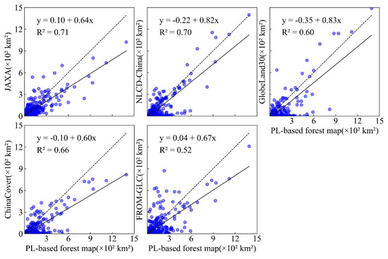 At the county scale, the good linear relationships between the PL-based and the other forest maps are found (Figure 8). The forest area of the PL-based map has a stronger linear relationship with the JAXA and NLCD-China forest maps (R2 = 0.71 and 0.70), but a weaker linear relationship with those of GlobeLand30, ChinaCover, and FROM-GLC forest maps; the value of R2 was 0.60, 0.66, and 0.52, respectively. The optical products tend to have lower forest area due to the forest area of partial counties being underestimated. The result of the linear relationships agrees with the accuracy of these forest maps in the plain region.